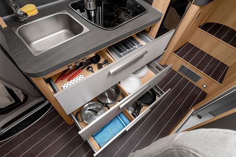 Entdecken Sie Schubladen mit kugelgelagertem Vollauszug. Diese fahren so weit heraus, dass sie bequem bis ganz hinten genutzt werden können.