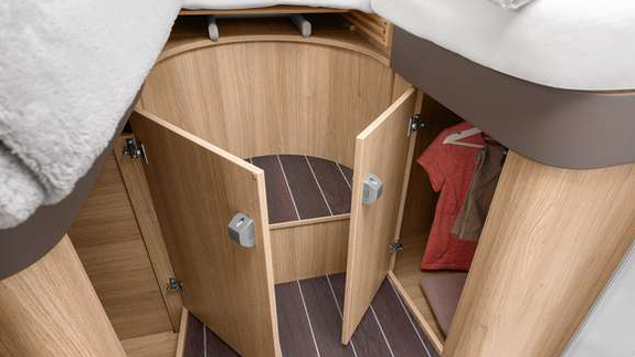 Die Kleiderschränke befinden sich unter den Betten. Hier haben Sie zahlreiche Ablagemöglichkeiten, Kleiderstangen auf beiden Seiten und eine praktische Beleuchtung. Der großzügig bemessene Zugang erlaubt eine einfache Nutzung.