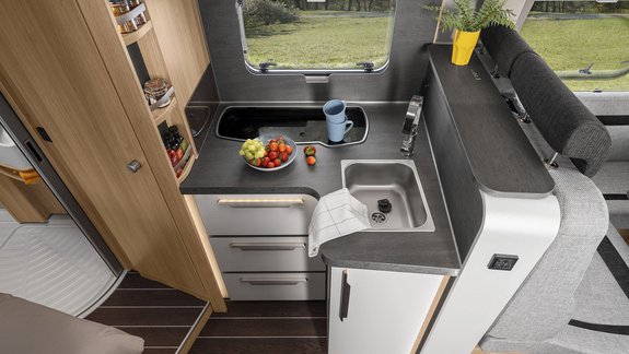 Die geräumige Winkelküche schließt sich direkt an die Sitzgruppe an und nutzt den vorhandenen Platz damit optimal. Erleben Sie eine maximale Arbeitsfläche und viel Bewegungsfreiheit.