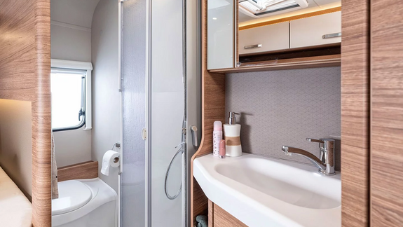 Durchdachtes Badkonzept im 600 MF: Toilette und Dusche sind vom Waschbecken räumlich getrennt. Schließen Sie einfach die Tür und das Wasser bleibt in der Dusche.