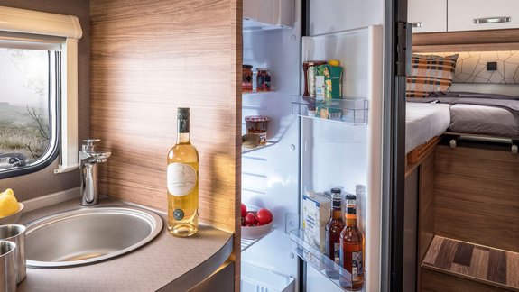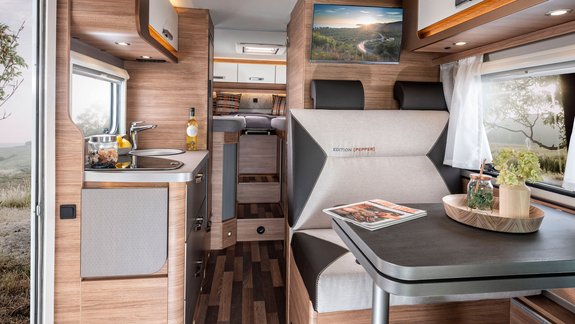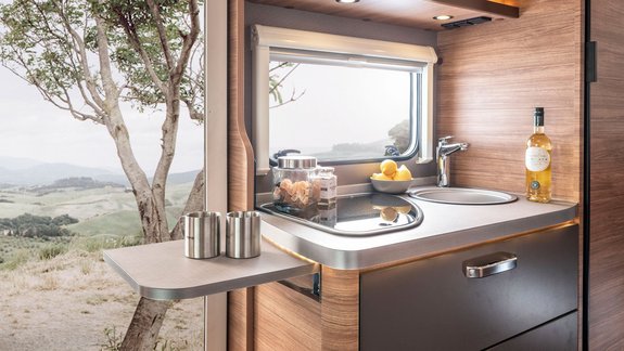 Fenster an den Seiten für Tageslicht und schöne Ausblicke, dazu noch Staufächer und Deckenschränke mit speziellen WEINSBERG-Griffen, die viel Stauraum bieten.