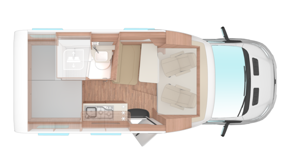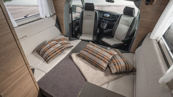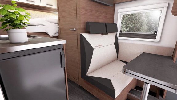 Drehbare Fahrerhaussitze – geräumige, gegenüberliegende Sitzgruppen bieten bis zu 6 Personen einen gemütlichen Treffpunkt.