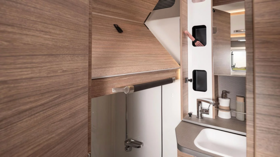 Komfortabel duschen: Mit der nach oben verschiebbaren Dusche mit einer Stehhöhe von 1,90 m haben Sie genügend Platz.